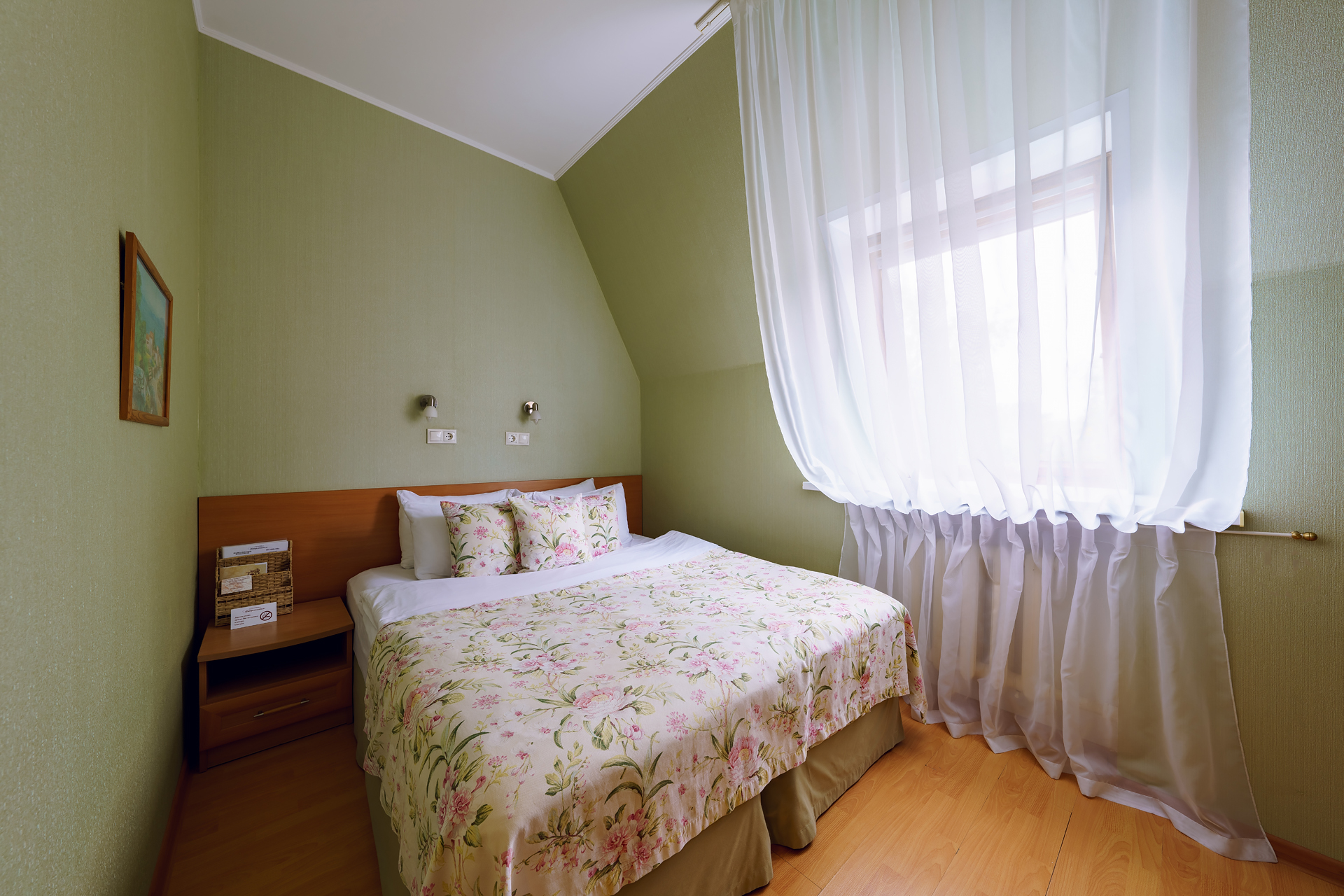 Номера не только очень просторные, но и светлые. Дневной свет проникает через окна. В номере категории «Комфорт» 2 окна, которые пропускают достаточно дневного света. Кроме потолочного светильника в номерах данной категории есть и дополнительные светотехнические приборы, которые представлены напольными и настенными лампами, а также бра, которые располагаются у изголовья кровати.