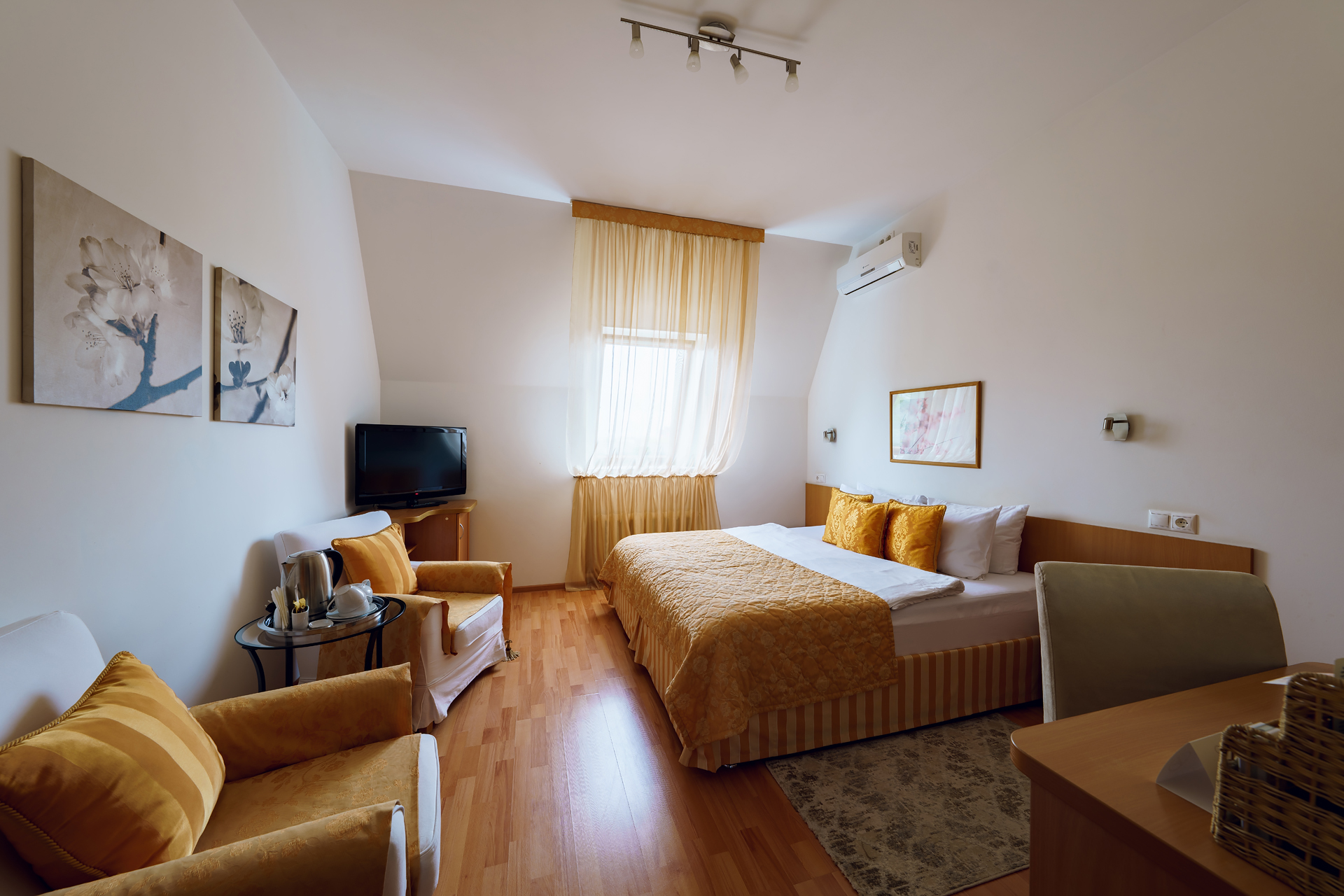 Двухместные номера категории «Комфорт» оформлены в классическом стиле. Отделка стен гармонично сочетается с мебелью, светильниками, интерьерным текстилем и прочим декором. Пол – деревянный/паркетный. Мы постарались удобно расположить дополнительные розетки. Несколько розеток есть возле рабочей зоны, а также рядом с кроватями.